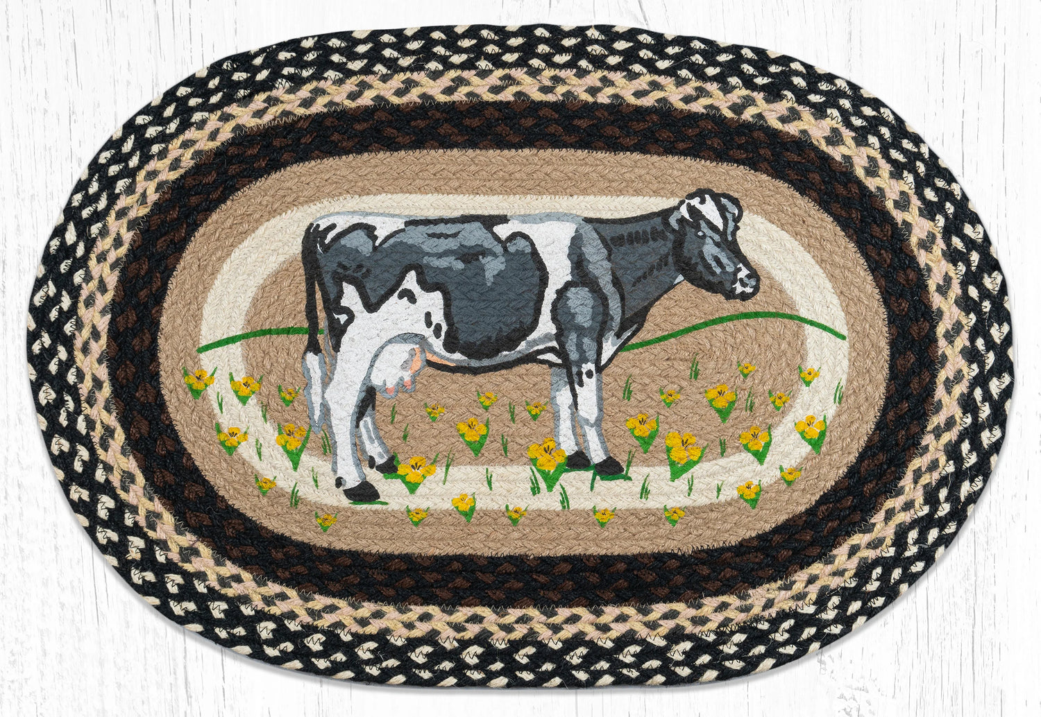 Introduce the In The Field Cow Oval Patch Rug, a perfect addition to your home decor. Made with high-quality materials, this rug is not only stylish but also durable. Its unique oval patch design adds a rustic touch to any space. Bring the outdoors inside with this versatile and eye-catching rug.