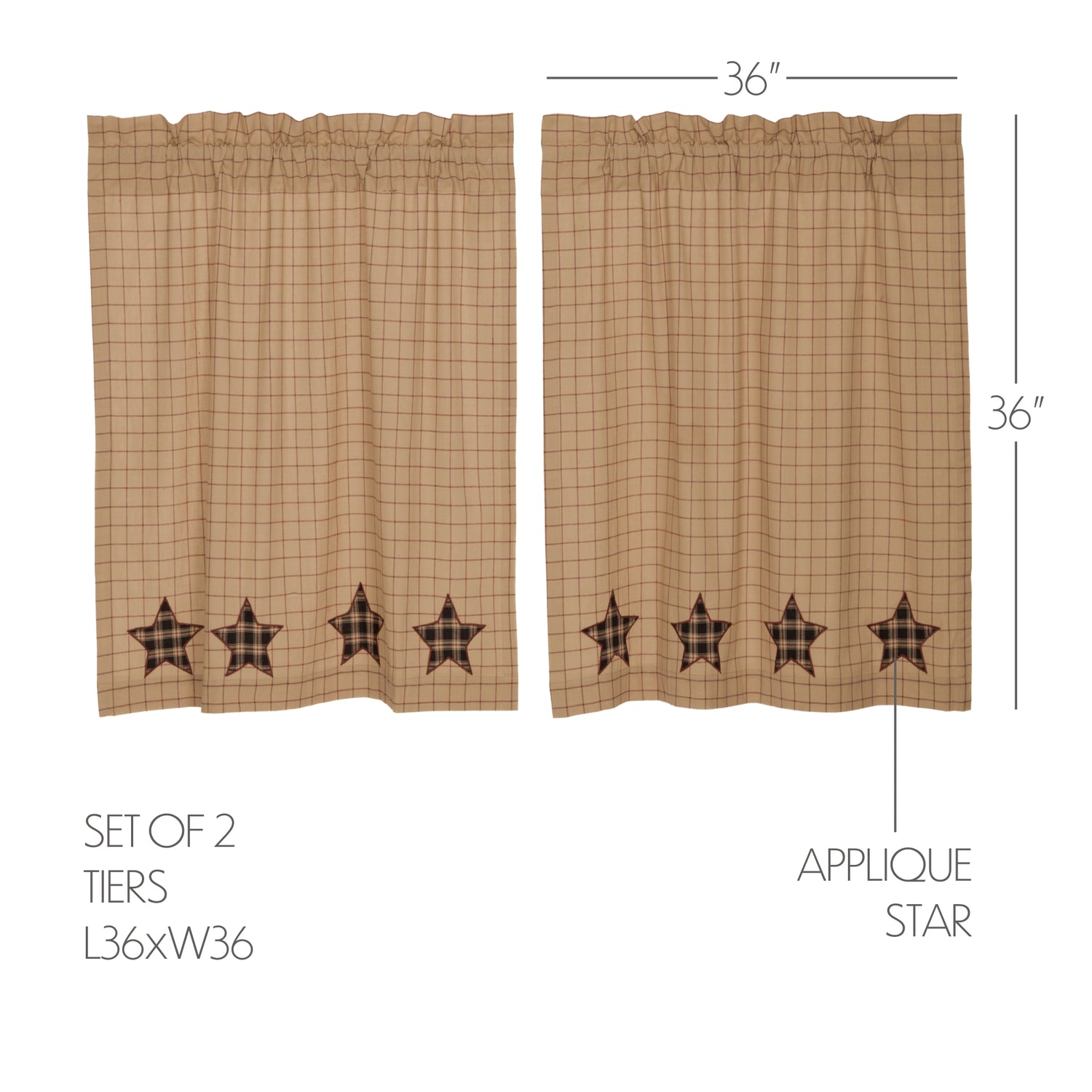 The Tan Plaid Star Tier Set offers sophisticated window treatment for discerning homeowners. These kitchen curtains feature a warm tan plaid pattern elegantly accented with star motifs, providing the perfect balance of light filtration and privacy.
